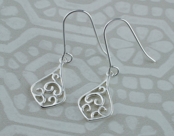 Beautiful 925 sterling silver fancy open work hook dangle earrings.