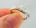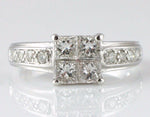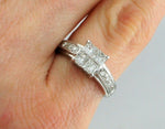 Very pretty 18ct white gold ring with 0.75ct princess and round cut diamond.