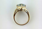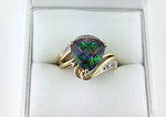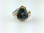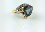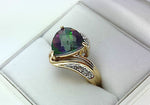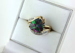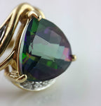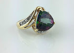 Lovely 9ct yellow gold ring with trillion cut mystic topaz and diamonds.