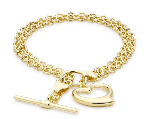 Beautiful 9ct yellow gold double strand belcher bracelet with heart charm and T-bar clasp.